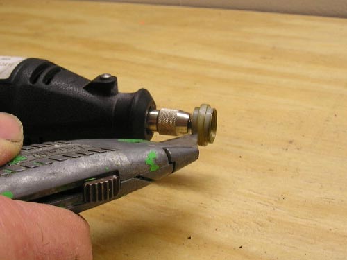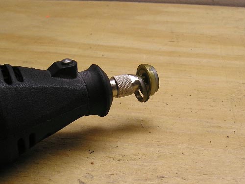 Insert the short piece of axle in the Dremel and press the wheel on. A drop of
