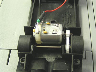4 screws are removed to expose the inner workings of the model. The motor is snugly held in place in the sidewinder position and I happily found that the bushings were very tight in their mounts and did not need any adhesive. Still, I always glue them regardless as a preventive maintenance measure and suggest you do the same. The front wheels are a solid axle design which should make most of you happy. The front guide rests almost flush with the rails on our ARTIN track and on tracks like NINCO with the rails a little higher it is almost a perfect tripod.